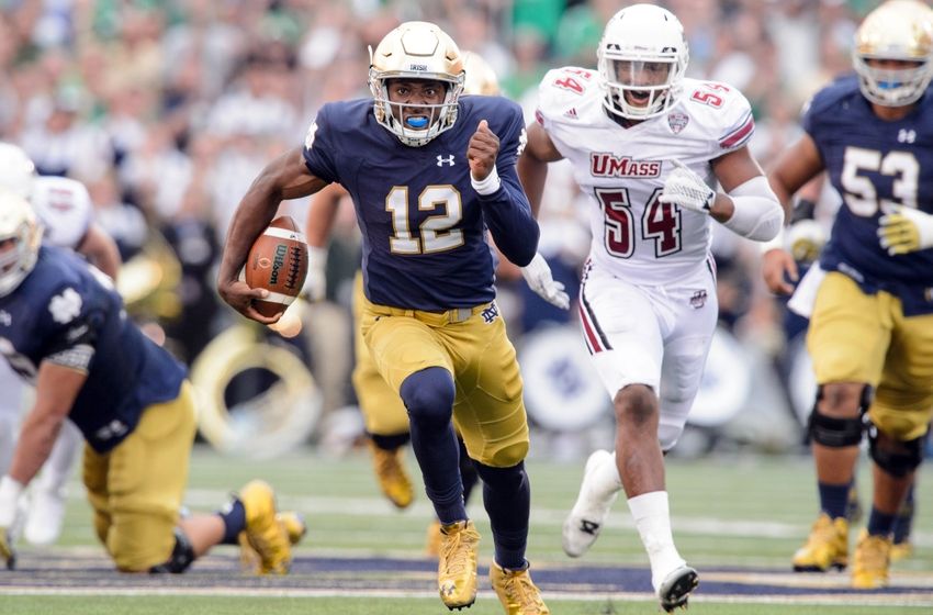 Sep 26, 2015; South Bend, IN, USA; Notre Dame Fighting Irish quarterback Brandon Wimbush (12) runs for a touchdown in the third quarter against the Massachusetts Minutemen at Notre Dame Stadium. Notre Dame won 62-27. Mandatory Credit: Matt Cashore-USA TODAY Sports Football The Clemson football vs Notre Dame match up has opened up. See who is the favorite and what to expect right here. The Clemson football team will host the Notre Dame Fighting Irish…
