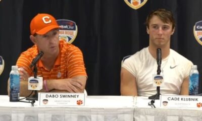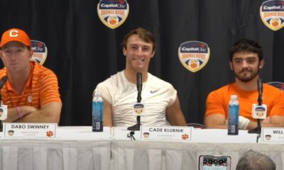 Clemson head coach Dabo Swinney and players Cade Klubnik, Will Shipley and KJ Henry talked to the...