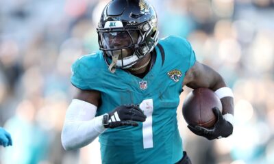 Trevor Lawrence #16 pitches the ball to Travis Etienne Jr. #1 of the Jacksonville Jaguars during the...