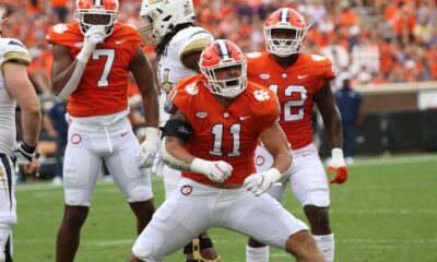 Barrett Carter (0) holds up his fist against Georgia Tech after a goal line stop during the...